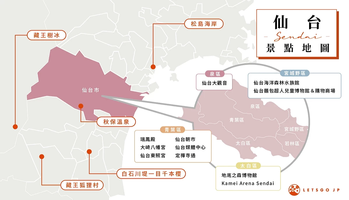 以下将「乐吃购!日本」的仙台景点整理成一份地图给大家参考,要来日本东北自由行的你,别忘了先把这份地图清单存好喔!